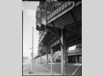 Beyond the Cathedral, Washington Street becomes wider and regular. The standard elegant type "F" arch-truss bent supports the system here. Since columns are directly under the track loads, the bents could be designed as light, efficient forms although subsequent analysis has revealed deficiencies in the lateral force resistance of the design. (See Anderson-Nichols & Co. report). [4] Washington Street is quite level in this area, so that bents have a fairly constant height. Longitudinal members are trussed adding to the light "airy" appearance of this portion of the line. Engineering News observed, "The structure ... leaves the street much more open and unobstructed than does the usual elevated railway, and the cross struts being arched present a handsome appearance as well." [5]