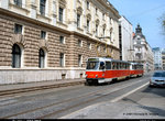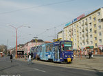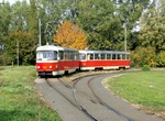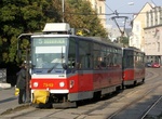 Tatra K2 - Articulated cars which, whilst similar in appearance at the front and rear to the T3SUCS cars above, are smaller and feature a partialy-corrugated side, very similar to that on New York's R32/38 subway cars. The most obvious difference is that the K2 cars are three-truck articulated cars with a turntable between the two sections of the car. As their capacity is lower than that of the other types of cars in the fleet, they seem to be restricted to quieter routes 3 and 13. Many of these cars have been rebuilt - see below.