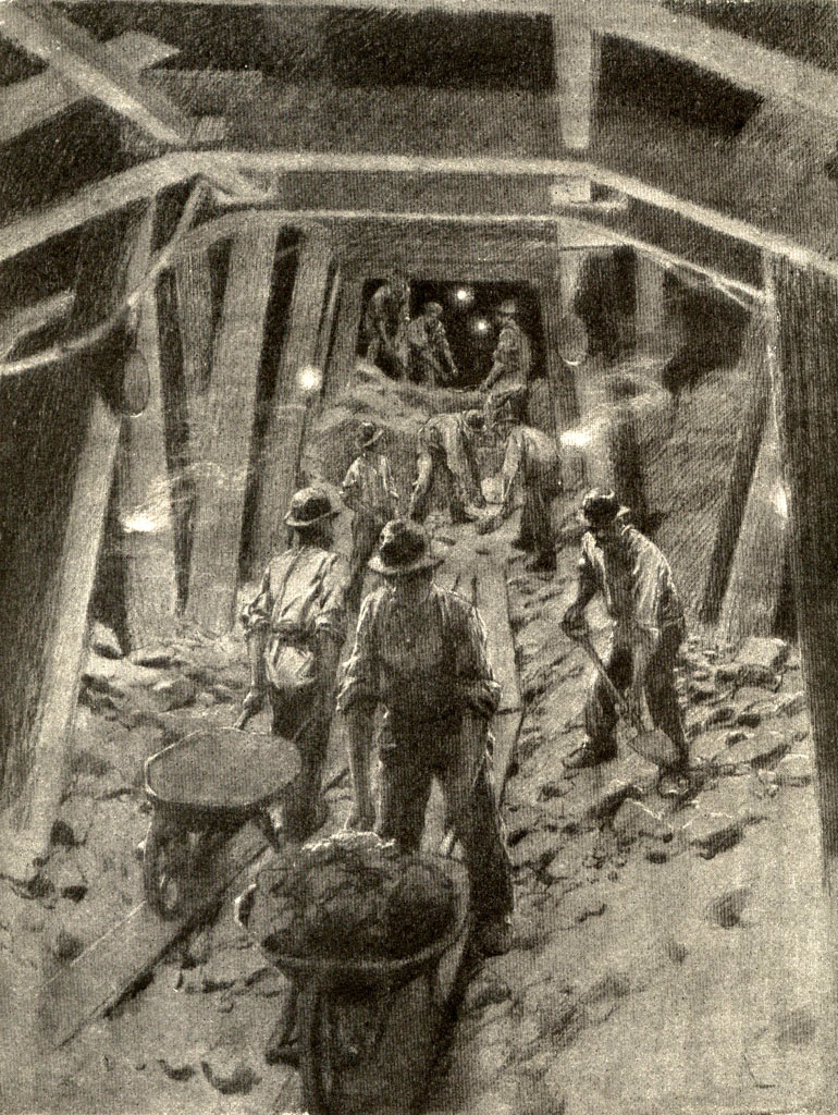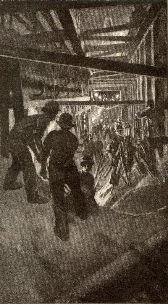 Daylight was half a mile or more behind. In front a narrow arched passage, so low that the jagged roof just grazed one's head, followed a thin vista of hazy electric lamps farther into the solid rock. The heavy air was chilled with the breath of the under earth, and every now and then from under the tramway ties, or out of the indefinite darkness, came the drip-drip-drip and gurgle of water.