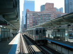 Almost in the Loop itself, we enter the station at Clinton (540W / 200N). This is an unusually high station because the L must pass over the large viaduct that feeds into the busy Chicago and North Western commuter rail terminal. Like most of the other stations on the Lake Street "L" so far, Clinton has side platforms and has been newly reconstructed as part of the Green Line rehabilitation. Fare control is located on a mezzanine below, with stairs and long ramps connecting the mezzanine to the platforms. An elevator and long stairways provide access to the street level. This station is mostly used as a convenient transfer point to the C&NW trains, but the surrounding area is also seeing a great deal of office and residential loft development.