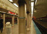 Our tracks curve toward the east, and we are now travelling under Division Street. We pass through a crossover chamber before arriving at Clark / Division (1200N / 100W), our next stop. Clark / Division has an island platform, with fare control on a mezzanine above. Stairs and an escalator provide access to and from the platforms. From the mezzanine, passages lead to all four corners of the intersection of Clark Street and Division Street. This part of town is in the Gold Coast, and is home to a number of touristy bars, restaurants, and clubs.