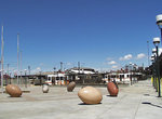 After leaving the "main line", a stop is made at Auraria West Station, two side platforms with glass-block shelters. Next, we reach Invesco Field At Mile High Station, adjacent to the Denver Broncos football stadium. There are multiple platforms in both directions. On the south side, marble footballs line the edge of the station. The shelters, however, are patterned after the simple ones found on the original route.