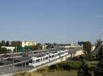 Basically, the Southeast Line parallels, and lies to the west of, Interstate 25, and arch bridge pathways are required to cross the tumultuous freeway traffic to reach the buses and parking garages. On the Nine Mile branch, the tracks lie in the freeway median of I-225. The trackway combines elevated, open cut and surface alignments throughout.