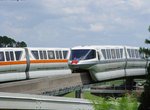 There are a total of 12 trains for the monorail. The exteriors are painted white with a colored stripe around the whole body below the windows. It is this stripe that identifies the train for communication purposes. The colors of the stripes are blue, red, black, gold, silver, pink, coral, orange, green, lime, purple, and yellow. Each train is 6 cars. The cars are permanently coupled with articulated joints between each. There is a full width cab in the end cars. The interior of all the cars is the same. There are two rows with 5 seats each at each end, as well as two rows of 5 seats in the middle of the car. You cannot pass between the two halves of each car. There are two doors on each side of each car that open outwards, then slide apart, like the front doors of an RTS bus. There are also poles for standees.