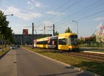The newest trams in Dresden are 45-meter-long, 12-axle Bombardier low-floor LRVs numbered in the 2800 series, 2801-2828. 32 of these luxurious trams were ordered, with deliveries beginning in 2003, and 28 were on the property and in service in early 2005. They are used on lines 2, 7, 11 and 41. Each 2800-series tram is also named for a Dresden-area community, suburb or district name (examples: 2801 = Lautzen, 2806 = Görlitz, etc.).