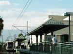 Departing Memorial Park, trains continue under cover, turning eastward to the portal where the right-of-way emerges into the median of the Foothill Freeway. There are three stations here: Lake Avenue, Allen, and the present terminal, Sierra Madre Villa. Needless to say, all are island platforms. While riding eastbound trains in the afternoon, watch for the train zooming past stalled traffic--a great selling point for rail transit in general.