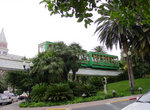 The next system northward connects the Monte Carlo Hotel with the now-famous Bellagio. This monorail runs between the rears of the hotels across some parking lots, but the stations are well-appointed, enclosed, fully accessible, and air conditioned. The two trains (one permanently mounted on each track) are rather bulbous monstrosities and are hauled with what appears to be a rubber belt running alongside the running rail. The cars appear to run in a "counter balanced" system departing their terminal stations at the same time and meeting in the middle, but hopefully can be operated independently such that one car can be out of service for maintenance without affecting operations.