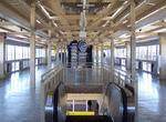 The next leg of the journey to the Convention Center station takes us high up, southwest and then south past the original part of the Las Vegas Convention Center. The Las Vegas Convention Center station is actually at the intersection of Paradise Road and Desert Inn Road, above Desert Inn on the east side of Paradise. It appears that if an event is going on in the "N" halls of the Convention Center, it will be closer to exit at the Hilton station than the Convention Center station, but still quite a hike. The Convention Center station is typical of construction, with the topside mezzanine, but is the station with the most obvious corporate sponsorship, that being Nextel, with a Nextel sales office very conveniently located topside and adjacent to the exit. In addition, a bright yellow train is adorned with Nextel logo ad-wrap.