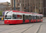 The stops have "medium-high" platforms. At the street stops platforms have been built at the edge of the sidewalk with slopes at their ends for wheelchairs. The system is DDA compliant (the UK equivalent of the Americans with Disabilities Act).