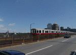 Leaving Kendall-MIT, the tracks begin a steep upgrade, reaching the surface at the west end of the Longfellow Bridge, which they cross on a center reservation. The bridge was built by the Boston Transit Commission and opened to the public on August 3, 1906. It is also known as the West Boston Bridge and the Salt and Pepper Bridge. The former name was inherited from its less ornate predecessor, while the latter honors its 8 towers, which resemble fancy salt and pepper shakers. The four towers around the center span give it the appearance of a drawbridge, which it isn't. The view is quite scenic here, offering a panorama of the Museum of Science, Bunker Hill Monument, Zakim and Tobin Bridges, and Charles River Park apartments to the north, and Beacon Hill. the Hatch Shell and the Back Bay Skyline to the south. In season, the Charles River, filled with many boats and bounded by parks adds a stunning vista on both sides.