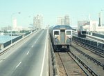 We are now on a very long tangent, and the Old Colony widens to two tracks. The next bridge spans Victory Road, soon followed by a pair of bridges over Morrissey Blvd. Between the bridges, one can see the remains of Popes Hill Station, another abandoned Old Colony stop. Conley street is quickly bridged after which we pass under I-93 again and come alongside Tenean Beach. Redfield St. crosses overhead and we enter the ramp leading to the Anderson Bridge which carries us over the Neponset River. Back in 1960, a fire under the south approach to the drawbridge located here, insured that the New Haven, owner of the Old Colony, would never resume commuter rail service, setting in motion the chain of events leading to the construction of the South Shore Extension. The new Old Colony main now crosses beside us on a bridge built in the 1990s. Beneath the northerly bridge approaches lies the site of the Old Colony's former Neponset Station. The view from this bridge is second only to that from the Longfellow, and includes many pleasure craft, a salt marsh, and the Boston Skyline in the background. We descend to a brief cut, passing under Quincy Shore Drive, and through the site of Atlantic Station on a southerly curve. Hancock St. passes overhead, and the route curves to the southeast again, passes through the scissors crossover at Interlocking 22, and enters North Quincy Station.
