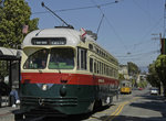 San Francisco MUNI 1951 "wings", green & cream. Rehabilitated from SEPTA PCC. Former SEPTA #2119.