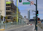 The T-Third Street route begins at Caltrain/4th and King, where tracks curve southward off King Street (Muni Metro Extension). An island platform, with angled platform canopies, a very tall mast and other features which will be typical of every T-Line station, is reached immediately. Then the tracks cross Mission Creek on the rebuilt draw span of the 4th Street Bridge and curve to the left onto Channel Street to reach Third Street. The trackway is set in alternating pink and gray concrete, which serves as a deterrent to motor vehicle traffic. Note the distinctive light fixtures, with heads reminiscent of pterodactyls.