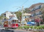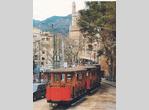 The ride doesn't finish here, however; a tramway line using heritage and some home-built cars operates from Sóller to the coastal town of Puerto de Sóller. The tramway, used by tourists and locals alike, runs 4 km. through the heart of the town of Sóller along streets and through its main square, and then via private right of way emerging at the edge of Puerto de Sóller's cove beach. The tramway was Majorca's first electric railway, operating since 1913. The tramway makes 17 stops along its route but only a handful are used-- those in-between the town centers of Sóller and Puerto de Sóller have limited boardings, mostly by locals (and railfans), and many are "flag" stops. The tramway is single track except at the Sóller terminal, at Ca'n Guida station, at Es Control station, and just past Marysol station outbound. (The penultimate station on the line, Marysol, is the current terminal of the line due to repair works between there and the usual terminal at Sa Pagesa.)