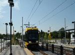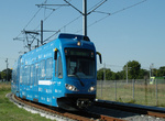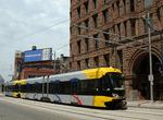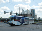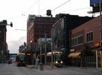 Minneapolis "Hiawatha" light rail trains in test operation at Warehouse District/Hennepin Avenue. Photo by Gary Ulmer, June 24, 2004.