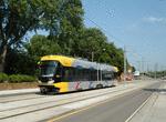 Minneapolis' new light rail project, the "Hiawatha Line", opened June 26, 2004, after three and a half years of construction. The line is 12 miles long, connecting downtown Minneapolis to the Mall of America via the Minneapolis/St. Paul Airport and the Minnesota Twins Metrodome. The light rail vehicles were manufactured by Bombardier, with 24 cars ordered and 2 more on option. The articulated cars are 94 feet long with passenger capacity of 187, including room for luggage racks and bicycle storage, and are of low-floor, ADA-compliant design. Service patterns have a train arriving every 7.5 minutes during rush hour, 10 minutes between trains midday, 15 minutes evenings til 9:00 pm, and 30 minutes during early mornings and late evenings. The route includes some street running, some tunnel, and some private right of way. The Airport stations are located in a tunnel segment.