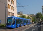 This city, located just a few kilometers inland from the western shore of the French Riviera along the Gulf of Lion, has a population of 230,000. On July 1, 2000, some 51 years after abandonment of Montpellier's first tramway network, the city instituted a brand-new 15.2km tramway line, the "Blue Line". 28 Alstom Citadis low-floor trams, model 301, instituted the new service. They were originally 6-axle trams, but beginning in mid-2002, were subsequently lengthened to 8-axle cars by insertion of a second bogie and suspended section aft of the section which contains the pantograph.
