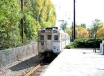 We pass County tower and a small storage yard on the north side and arrive at Jersey Avenue, a very unusual station. A spur track diverges from the southbound track just north of the station. The low platforms are in between the main line and the spur. In between the platforms is a large parking lot. Trains either terminate or originate on the spur track, or stop to drop off passengers on the main line low platform. Through trains from the