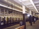 The Newark Subway operates out of the lower level, the entrance to which is located in the extreme northeast corner of the station. Stairs descend to an intermediate level where there is a old wooden token booth and artwork in bronze of subway riders. This artwork is entitled The Commuters by Gregory Gurevich and was installed in 1994. Down one more flight from the mezzanine level, the subway station has five low platforms with a wooden crosswalk between them (kept closed). Only the two side platforms are used for regular passenger service. Lighting is fluorescent and walls are tan tile. Passengers exiting the station use an escalator which bypasses this intermediate level directly to the Penn Station street level concourse.