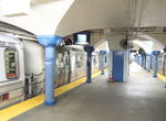 The platform area has a brown tile floor, and walls painted in a black, blue, white scheme, with "PATH" logos stenciled on a center stripe. The thick columns are tile around cast iron, the plain iron tops of which are painted powder blue.