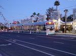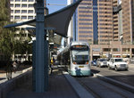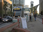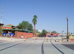 Once double track resumes, the line is fast and the signals are pre-empted (for the most part). Stations are located at 38th Street/Washington and 44th Street/Washington, where riders can transfer to the free shuttle bus to Phoenix Sky Harbor International Airport. (A people mover will be built, replacing the bus.) Following 44th Street, the line continues eastward. Just before passing under the Arizona 202 freeway, there is a two-track access route to the Valley Metro Light Rail Maintenance Facility, which is visible from the freeway. Entering Tempe, the route curves gently toward the southeast, and the station at Priest Drive/Washington is reached. Another station is located at Center Parkway/Washington before turning southeast and crossing the Salt River and into downtown Tempe. The bridge across the Salt River parallels the Union Pacific trestle bridge. Next comes Mill Avenue/3rd Street in downtown Tempe. The old grain elevator, a symbol of old Tempe, is north of the station. The next station is Veterans Way/College Avenue at the Tempe Transportation Center and the beginning of the route through the Arizona State University campus. Sun Devil Stadium is nearby. The second station serving ASU is University Drive/Rural Road. Following this stop, the line runs down Terrace Road toward Apache Blvd., where the route makes a 45º turn east. Along Apache Blvd., stations are located at Dorsey Lane/Apache Blvd., McClintock/Apache Blvd., Smith-Martin/Apache Blvd. and Price-101 Freeway/Apache Blvd. The end of the line, in Mesa, is Main/Sycamore. There are tail tracks to lay up trains here (similiar to those at Montebello/19th Avenue).