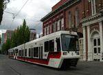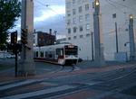 Yamhill District and Morrison/SW 3rd are near the historic heart of Portland, but have seen light rail bring in two new modern office buildings on Morrison Street. the curving Yamhill District platform takes up the entire width of Yamhill Street in order to make a tight turn onto SW First.