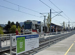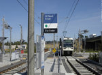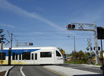 Inbound MAX Green Line crossing one of two grade crossings on the line at SE Flavel. Photo by Peter Ehrlich, September 2009.