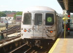 Train of R-46 cars on F service at Smith/9th Street on the IND Crosstown Line. Photo by David Pirmann, August 2000.