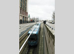 The Techopôle line is longer and more interesting. Between Europa and Hôtel de Ville-Sotteville, it's street running most of the way, and the sights include an open-air market. At Hôtel de Ville-Sotteville Station, a massive cantilever canopy covers both tracks. Then the line winds its way through the suburb of Sotteville-les-Rouen, occasionally in the center of streets and sometime in side-of-road reservation, passing several parks (including Le Parc in St.-Etienne-du-Rouvray), finally reaching Technopôle. Unlike George Braque, cars unload passengers, head into a pocket track and change directions before heading to the inbound platform.