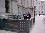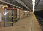 Fairmount. This station has a full mezzanine and connections to the Broad Street subway main line. There is one island platform with two tracks and no wall tile. There are two removed center exits as evidenced by the bottom tread still in the concrete. The active exit is at the north exit. The south end of the station has been shortened--more platform can be seen beyond the public area. The north end of the platform tapers slightly. This station needs tons of TLC and I was eager to leave.