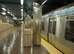 We pass through 19th and 22nd Streets on the center "express" tracks, while the subway-surface cars serve these local stations on the outermost tracks. We cross under the Schuylkill River and arrive at 30th Street. 30th Street has an island platform serving the two heavy rail "express" tracks and two low level wall platforms for the subway-surface cars using the "local" tracks. The island platform has a brown tile floor. The sidewalls of the low platforms have green accents with blue/gray top and bottom, featuring an New York IND style tile stripe. The main wall color is cream. There is a full mezzanine which once had a direct entrance to the 30th St. Station (which serves Amtrak and the Regional Rail lines), but was closed due to crime concerns. Signs are blue and the I-beams are wrapped with stainless steel. This station was recently renovated with accessibility improvements. These include new signage, tactile warning strips, elevators, and entrance improvements. The existing entrances became sort-of kiosks and a new "master kiosk" entrance was created. It includes benches, skylights, an elevator and stairs. The stairs and elevator lead underground where there is still a big space, open to street level. It should be seen in person to really understand what I'm saying.