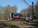 Just north of Villanova, beyond the crossover, the line curves sharply eastward. At the curve, the alignment of the former Strafford branch can be seen straight ahead. Although the tracks have been gone for 45 years, the grade is still visible, and a bicycle trail has been proposed for this right of way. Your train vaults over Lancaster Pike (US 30) into the busy Radnor stop. Radnor has become an important reverse commute location, with major employers nearby (among others, TV Guide calls Radnor home). After another quick turn to the right, you pass under the Amtrak Main Line to Harrisburg (where SEPTA's Paoli/Downingtown R5 electric trains run) and begin to parallel I-476 (known locally as the Blue Route) behind the noise wall on your right). County Line stop passes and you cross from Delaware County to Montgomery County as you curve to the left away from the unseen highway.