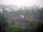 Past Bridgeport, the single-track line curves slightly to the left and then crosses the 3/4 mile viaduct across the Schuylkill River. Downtown Norristown can be seen to the right. At the end of the viaduct, a slight "S" curve brings your train across the ex-Reading freight and passenger tracks (SEPTA's Norristown R6 electric trains operate here) and then onto a 2-track line once again for the short ride into the Norristown Transportation Center. Before the Center opened in 1989, the single-track line continued another block east to Main and Swede Streets. Although the el structure and station are gone, the doors to the former platform can still be seen in the building at the southeast corner of this intersection.