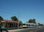As the tracks leave Mountain View, they merge to a single track and continue to parallel the Caltrain tracks. The next station, Evelyn, is a single track station, whose only access is through a pedestrian tunnel under the Caltrain tracks. After Evelyn, the light rail tracks curve away from the Caltrain tracks, crossing the adjacent street. An interesting feature of this crossing, is that the northbound lanes have an additional crossing gate. This secondary gate comes down only a foot above the road and appears to be a physical barrier to stop errant automobiles. Once across the street, the line cuts through a new housing development and becomes double tracked, stopping at Whisman and Middlefield. The line then skirts the edge of Moffett Field (NASA/Ames), stopping at NASA/Bayshore and Moffett Park on its way to its way to Lockheed Martin.