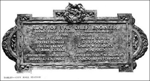 When City Hall Station opened, plaques were hung on the track-side wall commemorating the Interborough Rapid Transit company and honoring the Rapid Transit Subway Construction Co.. The plaques listed the directors, engineers, and financiers, including August Belmont, Cornelius Vanderbilt, and John D. McDonald. These plaques were removed when the station was closed, and relocated to the Brooklyn Bridge station, where they hung near a token booth until 1995. As of early 1996, the plaques are back in their original positions on the trackside wall. Contrary to popular rumor, there was no plaque here honoring Alfred Ely Beach's early pneumatic subway.