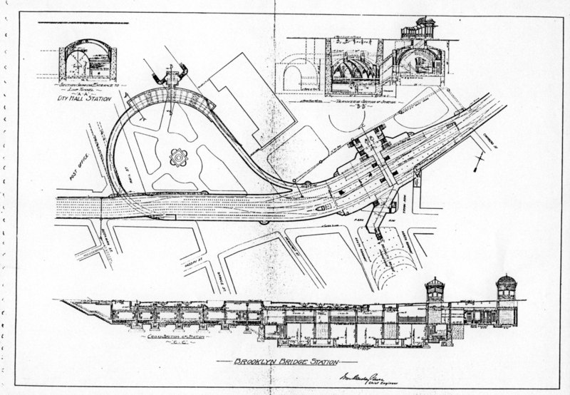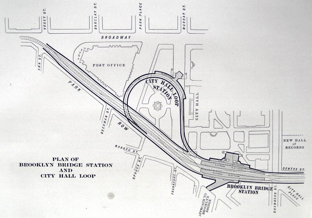 Diagram from the I.R.T. commemorative book The New York Subway: Its Construction and Equipment, shows the relative locations of Brooklyn Bridge and City Hall stations. |