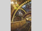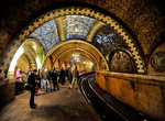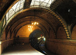 City Hall Station, situated on a loop of track in front of City Hall, was the original southern terminal of the Interborough Rapid Transit subway. The site of the 1900 groundbreaking, this station was designed to be the showpiece of the new subway. Unusually elegant in architectural style, it is unique among the original IRT stations. The platform and mezzanine feature Guastavino arches and skylights, colored glass tilework, and brass chandeliers.