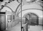 The mezzanine featured a wooden ticket booth and two stairways to the street. The ticket booth is long gone. The complex green, tan, and white tiling pattern on the ceiling meets in the four corners of the vault over the mezzanine.