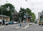 On Hölderlinstraße and Hegelstraße the light rails run in the street with mixed traffic. The former trams used the Hölderlinstraße only in the direction toward Hölderlinplatz, returning via the Kornbergstraße. The next stop Russische Kirche with island platform lies in a steep inclination in the middle of the Hegelstraße.