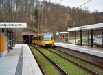 After leaving Degerloch Albplatz the trains go down by a ramp into a tunnel leading to the underground station of Degerloch. This station lies in an inclination, therefore there is no mezzanine at the west end of the 120m long island platform. At this side stairs and a lift connect the platform directly with the surface bus stops. At the east side of the platform a pedestrian ramp leads to the mezzanine and a further ramp and stairs from there to the surface with the terminus of the rack line 10.