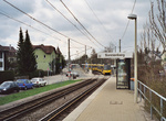 The U1 turns again left in a big curve and arrives at Schwabenlandhalle station. The section from here to the terminus is on a reservation at the south side of the Tainer Straße with grass tracks. In 2007 two high side platforms were built at the Fellbach Lutherkirche station.