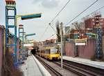 The Maybachstraße station has two side platforms with a mezzanine in the middle of the station. Short parts of the platform are still at low level, but not in use. After leaving the tunnel the tracks cross over a tunnel portal for railways. The next station lies in front of the station building of Feuerbach Bahnhof. The side platforms are reached by level crossings at both ends. After this stop the light rails turn left and reach a further tunnel by a ramp. This tunnel opened on November 3rd 1990 and replaced the former tram routes through the suburb of Feuerbach. The tram used two different streets for outbound and inbound trains.