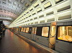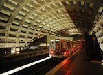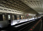 Metro Center (lower level). Next, we arrive at Metro Center's lower level platform. The connection to the WMATA Red Line is upstairs. There is a low ceiling, similar to that at L'Enfant Plaza, and only the station's waffle sidewalls are visible, due to the upper level's pod covering the entire length of the platform. Lighting here is better than at L'Enfant Plaza. Sometimes, trains are held briefly in order to connect with Red line trains arriving above. Congestion is common here; and sometime train traffic backs up. Just north, the tracks take a sharp, 90-degree turn from 12th Street NW into Eye Street NW. Metro Center station lower level opened July 1, 1977.