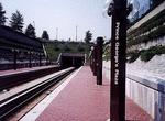 Anacostia. This former terminus of the Green line is here at Anacostia, on the other side of the Anacostia River, near the intersection of Howard Road SE and Shannon Place SE. This is the first station serving the Southeast community (Capitol Heights, three miles northeast, is on the border of the two district divisions). For all intents and purposes, it is an underground station, but there is a difference - there's a building sitting on top of it. If this building were removed, the station would be in an open cut. The aforementioned building houses the station entrances and parking garage, which has 808 all-day spaces plus 325 metered spots. There is a station entrance at either end of the island platform. The walls of the station are not vaulted - they have a simple, smooth concrete finish. The ceiling is unique - round vaults run perpendicular to the tracks, and the effect is as if you had cut concrete pipes in half and set them into the ceiling. The vaults are also lined with acoustic panels. This station had to circumvent a number of difficulties associated with its location and construction - a couple of local roads, a freeway and the water table of the Anacostia River - a very complex planning and construction job was accomplished here. Anacostia station opened December 28, 1991.
